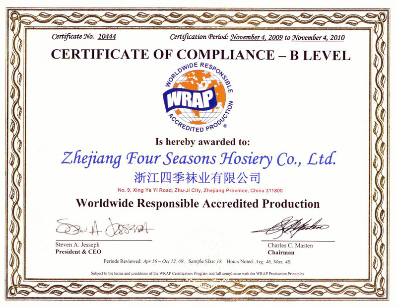 With our dedication towards quality production, Four Seasons Hosiery is proudly to be certified and recognized by our business partners below.